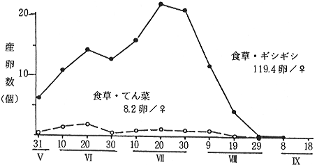 までに約50%が死亡し、産卵量も6個前後/1雌と少ない。ギシギシの飼育では50%死亡が7月下旬〜
