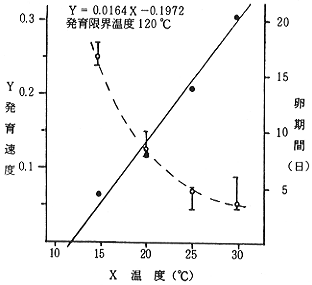 3)25℃飼育での産卵が最も多く120個に達する。1〜2半旬前の日照時数が多いと産卵量が多くなるこ