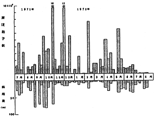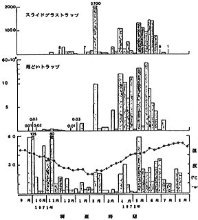 第2図 子のう胞子分数の季節的変動と降雨、および温度