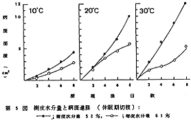 樹皮水分の多い枝では病原菌の生育適温(25〜30℃)にあるにもかかわらず、病斑進展が抑制さ