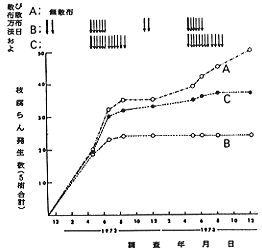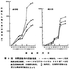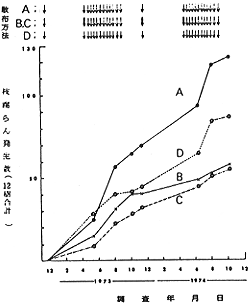 布(生育期前半、第7図)でも、本病の発生を滅らすことが出来るが、その効果は全生育期散布に劣っ