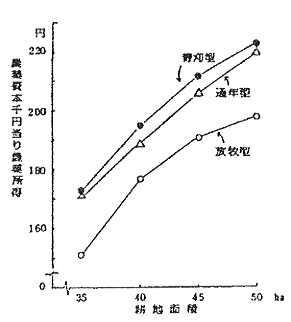 ④以上の結果、青刈型・通年型は放牧型に比較して労働及び資本集約的な技術である。それらの方式は労働力3人が前提となってその生産性は高まる。