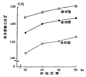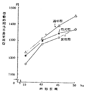 ②①の労働条件のもとで各類型の集約度を比較すると、ha当り労働時間及ぴ農業資本はいずれの耕地面積においても通年型>青刈型>放牧型である。