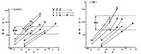 | 昭57 | 4月27日 | 5月 8、19日 | 6月17〜 22日 | (ベット幅60通路40株間30cm)2条植6.7株/㎡ |