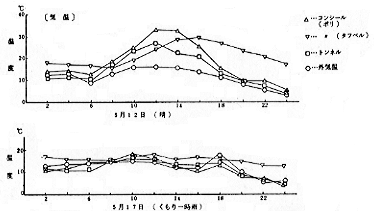 (2)コンシール資材としては、発芽前後に高温障害を受けやすいポリに比べ、タフベル(4000N)が省力的であり、夜間は保温効果が高く有効である。