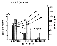 以上から、標準規格品を生産するための条件を述べると、「旭交春青」は栽植密度をa当1,000株前後とし、生育日数55、60日をめどに、抽出根長7〜10㎝、根径6〜7㎝時に収穫する。