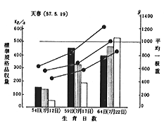 (3)平均一揖重は、同時収穫で密植区ほど軽くなるが、日数を経過すると、前調査の粗植区の根重に達した。