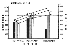 (5)標準規格品収量は、「旭交春青」「耐病総太り」が密植で多収、「天春」は密度による差は判然としなかった。いずれも収穫時期によって多少があり、適期を把握する必要がある。