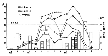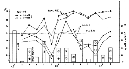 (2)pF値の推移から56年はかん水不要年、57年はかんばつ年、58年はややかんぱつ年であったといえる。かん水区のかん水量は56年4回(40㎜)、57年15回(150㎜)、58年6回(60㎜)であったが、56年はかん水処理後異常降雨があり、かん水の効果をみることはできなかった。