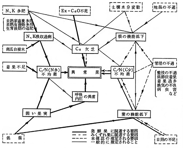 (3)栄養:窒素・加里の、肥大期あるいは成熟期における肥効過多。(特に成熟期)。これに遮光あるいは土壌水分変動条件は相乗する。成熟期における土壌水分の不足あるいは変動(み)。塩基置換容量の小さい・塩基飽和度の低い・特に置換性石灰の少ない土壌(ただし、石灰多施用および葉面施用の効果は不明、みくずれ果に有効?)。南瓜台接木。二番果早期着果による競合。