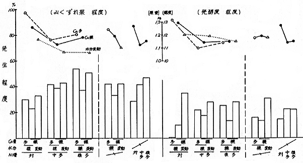 (2)石灰の影響 予期に反して多施用により異常果を多発した。多肥で、果実中のCa含有率の他、N及びKの含有率も高まっていた。葉面施用(ピリドキシンまたはリフレッシュ混用)の効果は明らかではなかったが、不良環境下における多発化をやや抑える傾向が認められた。