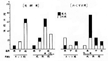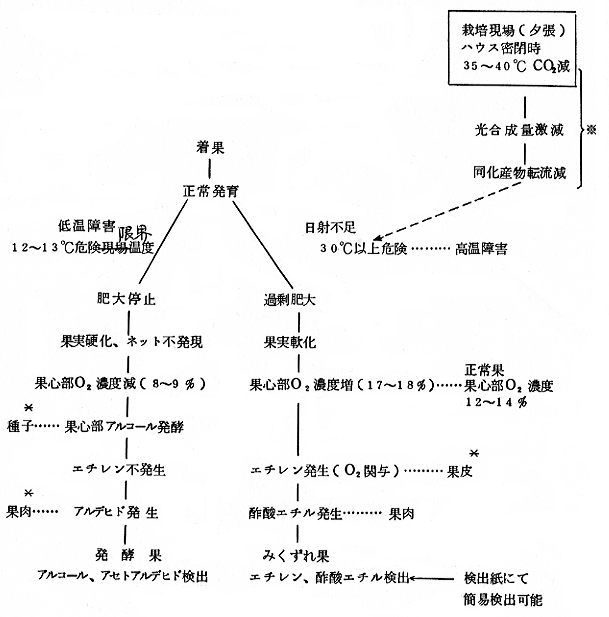 (5)温度の影響 生育の中〜後期の低温で発酵果が多発し、遮光条件でさらに助長された。ネット期からの低温条件の影響が大きい傾向となった。また、成熟期の高温遮光条件でみくずれ果が多発した。
