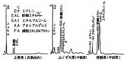 ①正常果は、成熟初めにエチレンを発生し、成熟が進むにつれて酢酸エチル発生量が多くなった。さらに過熟になるとエチルアルコール等も発生してきた。