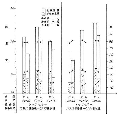 全株重が前年より小さかったのは、南北棟ハウスで昼間高温乾燥気味に経過したためと考えられる。トップセラーの生育が早く、コーネル619より大株となった。特にコーネル619では低温室での生育が劣り、かつ花芽形成も早く、3月23日残存株の抽苔株率は、トップセラーが平均31%であるが、コーネル619は60%で、高低両室での差はなく、この時期の大株生産では更に温度の検討が必要である。