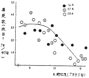 2)ほ場試験結果からK過剰による生育遅延は(着果期の着果数低下)、概ねK飽和度7〜9%を越えると発現した。K過剰によるCa、Mg吸収抑制に基づくと思われるこの生育遅延は、収穫期の遅れ並びに冷害年などでは収穫個体数の減少をもたらす原因となり、収量、品質及び市場経済性の低下と結び付いた。