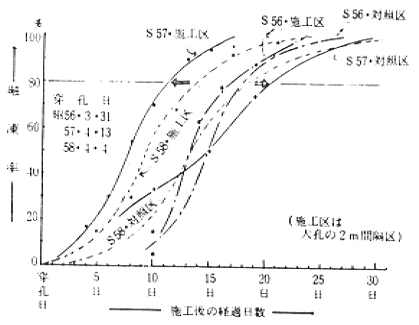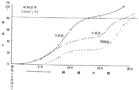 3.穿孔要領としては、穿孔径10〜15㎝、穿孔間隔2〜2.5m、穿孔の深さ50〜60㎝が適当と思われた。