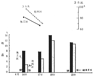 図4.各区の表土の地温と含水比の推移(昭和56年、5cm深)