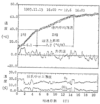 に達し、槽温上昇率は、各々、6.1,2.7℃/日であった。 (図1)