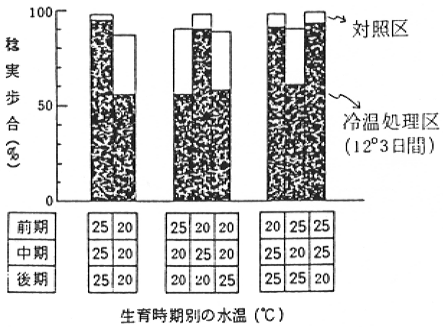 ① 耐冷性を変動させる水温処理時期(Fig1):穂首分化期から開花終期までの水温を25℃にして培養したイネは、水温20℃で培養したイネにくらべて明らかに耐冷性が高かった。この水温による耐冷性の変動は、穎花分化期から小胞子初期まで(Fig1の中期)の水温によるものであり、頴花分化期以前(前期)および小胞子初期以後の水温によっては影響されなかった。