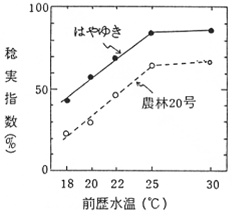 ① 品種:はやゆき(耐冷性強)および農林20号(耐冷性弱)、②培養:1/5000アールポットに円形20粒まき、ファイトトロン自然光室24/19℃で培養、主稈穂だけを供試、③水温処理:特定の期間だけ自然光室内の恒温水槽にポットを浸漬して、ポットの水地温を18〜30℃の範囲で、水深を1〜15㎝の範囲で一定に制御、④耐冷性検定:小胞子初期に12℃の自然光室で3〜4日間処理して不稔を誘導し、成熟期に稔実歩合を調査。