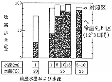 ③ 前歴水温による耐冷性変動の水深による差異(Fig3):やや冷涼な前歴気温(20/20℃)の下で前歴水温を25℃に高めたときの耐冷性の向上効果は、水深1㎝でも僅かに認められ、水深10㎝までは深くなるほど大きく、10㎝以上では変らなかった。