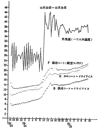 (4)普通シートにドライアイスを使用した実験例では10時間で2℃昇温した。つまり保冷シートを使用しなくても普通シートで充分品目の昇温を抑えることができた。
