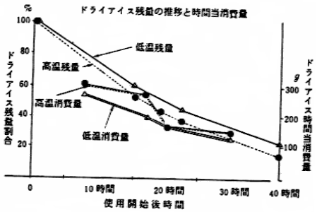 (2)ドライアイスの消費は温度が高い程多く、又使用始めが多く、後半は少なくなる。即ち25℃外温に対し、最初の14時間、1時間当0.3kg、次の4時間0.27kg、次の4時間0.17kg、後半0.14kgと減少する。