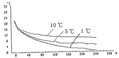 ②品温効果は風温が低いほど早かった。静圧10mmAqで初温21〜22℃のニンジンを冷却したところ、品温が10℃降下するのに要した時間は、風温0℃では30分、5℃では45分、10℃では1時間30分であった。冷却速度と品質保持の点からみて適正風湿は0〜5℃と考えられる。