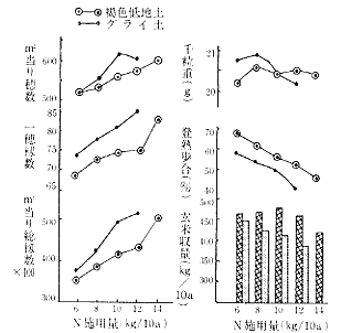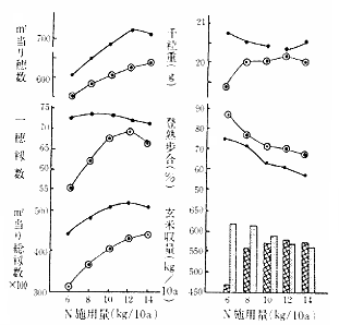 6)褐色低地土における窒素施用量は施肥基準量でよいが、施肥量が少なめであれば分けつ期から止葉期の窒素濃度の低下を伴い、一穂級数が減少し易く、千粒量の低下も伴う。従って幼穂形成期はりも早目の追肥が有効で、止葉期追肥との組合せが最も効果が高い。基肥窒素量が基準よりも少ない場合の減収率は中苗に比べて明らかに大きい。