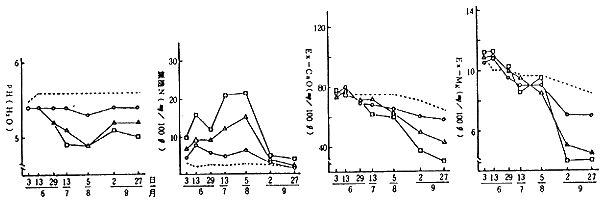図−1.汚泥施用に伴う土壌の変化…無施用,○1t/10a,△3t/10a,□5t/10a