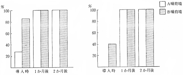 1)哺乳雄子牛の鼻汁中からL-マイコプラズマならびにウレアプラズマの検出を経時的に行った結果、L-マイコプラズマならびにウレアプラズマは、感染牛から未感染牛へ、汚染畜舎から未感染牛へ容易に伝播することが明らかとなった。