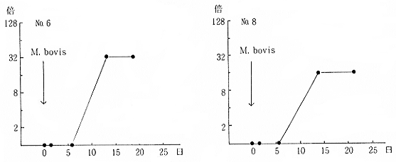 図3. M.bovis接種群のM.bovisに対する間接赤血球子凝る集抗体価の推移