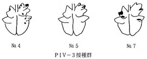 2)M.bovisならびにPIV-3を用いて各々人工感染試験を行った結果、ともに軽度の肺炎病巣が形成されることが明らかとなった。