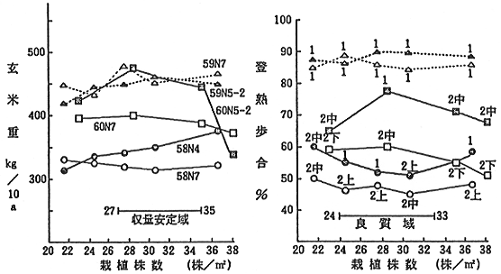 「キタアケ」、「ゆきひかり」、「みちこがね」の栽植株数は27〜30株/㎡が、「ともひかり」はそれよりもやや広い27〜33株/㎡が適当である。「キタヒカリ」は27〜35株/㎡が良いが、倒伏を考慮すると30株/㎡が限界で27〜30株/㎡が望ましい(図1)。