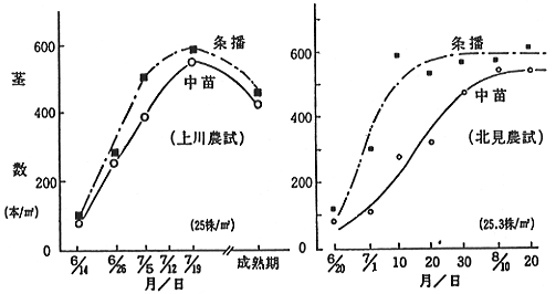 (4)初期茎数の増加は旺盛であり(図−1)、出穂期は中苗マットに比し北農試・中央農試で0〜1日上川・北見で2〜5日促進された(表−2)。収量は中苗マット苗に比し、北農試・中央農試で1〜3%、上川・北見で8〜18%多かった(表−2)。