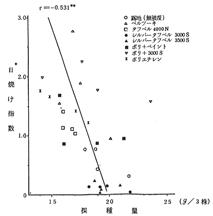 4)花球の日焼けと採種量との間には高い負の相関関係が認められ、日焼け程度が高い程採種量は減少した。