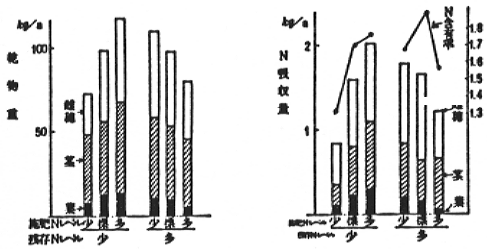 2 N吸収量では、残存N少−施肥N多区で1.6kg/aと多かった。残存N多区では、施肥Nが多いとN吸収量は減少した。栽植密度では、標準区に比べ栽植密度を高くしてもN吸収量は余り増加しなかった。器官別N吸収量では、茎葉部50%、雌穂部50%であった。(表1,図1)