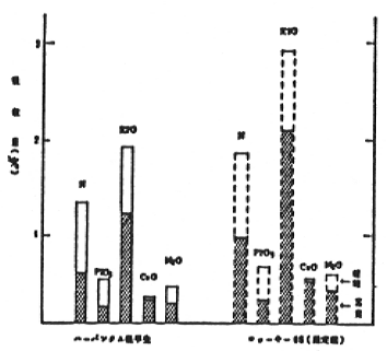 3 他の養分吸収量では、Kが比較的多く吸収され1.2〜1.6kg/a,P・Ca・Mgは0.2〜0.5kg/aで乾物重の多い区ほど多く吸収された。(表2) また、品種を草勢の旺盛な品種に変えた場合(ロッキー85)N19、K2O2.9kg/aの吸収量があると考えられた。(図2)