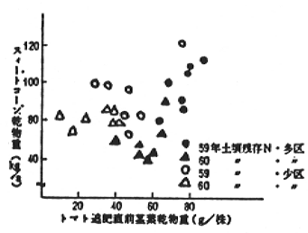 4 後作トマトの生育は、土壌残存N多区においてはスイートコーン乾物重が多い程トマトの生育も良くなる傾向があった。(図3)