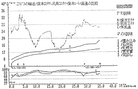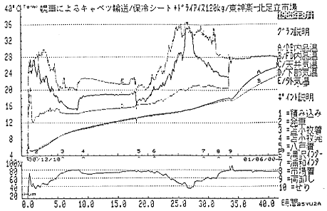 (2)キャベツ、ダイコンのトラック輸送 7月30日〜8月1日に東神楽町から東京まで保冷車および保冷シート(トーレペフシート8mm)付幌車で輸送した。ドライアイスを120kg使用した。