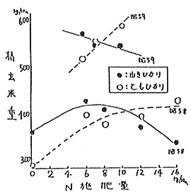 | 1.窒素用量試験(kg/10a) | 昭和58年 | N:0,6,8,12,16 | グライ土 |