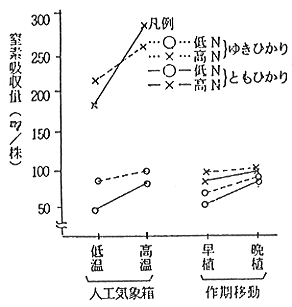 2.「ゆきひかり」は生育前半におけるN吸収が盛んであり、特に低温条件で顕著であった。このようなN吸収特性は幼穂形成期前後の稲体のN濃度を高め節間伸長を促がす要因と考えられた。この傾向はN増肥によって助長された。