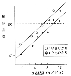 5.倒伏の危険性は倒伏指数100で認められた。また「ゆきひかり」は耐肥性が「ともひかり」に比べ基肥N量3kg/10a程度少なかった。(倒伏指数=曲げモーメント(高さ×重さ)/挫折強度×100)