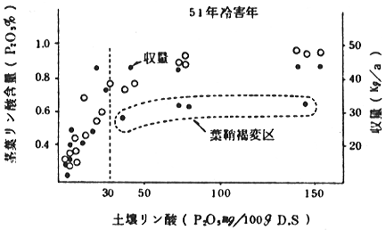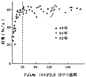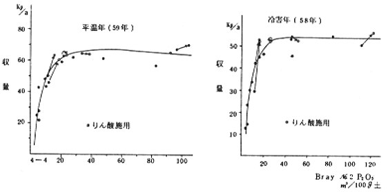 平温年、冷害年それぞれにおいて、分げつ盛期のプレイりん酸が、各々25mg、30mgで収量は頭打ちとなり、このプレイ値で分げつ終期付近の茎葉のりん酸含有率は各々0.6〜0.7%、0.7〜0.8%となった。