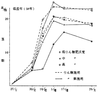 2)分げつ盛期のプレイりん酸が、高収年で25mg、冷害年で30mg付近未満の場合は、りん酸施用で茎数、乾物重などの生育増加は著るしく、りん酸含量及び収量も増加した。先のブレイりん酸値以上にある場合は、初期生育の増大を示した場合でも、幼形期頃にはりん酸無施用の場合の生育に収れんした。