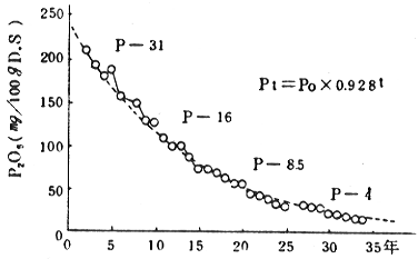 2)1)と同一の土壌のプレイりん酸の年次変動と収量の年次推移より、蓄積りん酸の肥効の程度を知る。