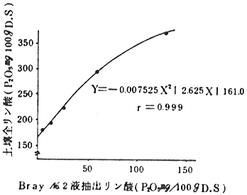 5)ブレイりん酸の増加量と、対応する土壌全りん酸との間には、極めて相関の高い2次の回帰式が得られた。この式より各りん酸水準にある土壌にりん酸を施用した場合に増加するブレイりん酸値を推測することができた。ブレイりん酸が25mgの肥沃度水準では施肥りん酸の45%、100mgの水準では施肥りん酸の約90%がプレイりん酸として回収される。
