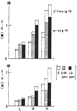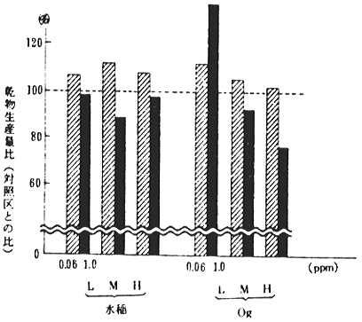 (3)この乾物生産への影響は、作物の窒素栄養状態で異なり、オーチャードグラス1.0ppm接触の場合、低N施肥は増加し、高N施肥では逆に低下する傾向がうかがわれた。(図-1)