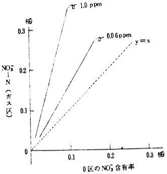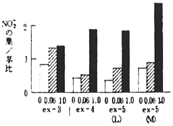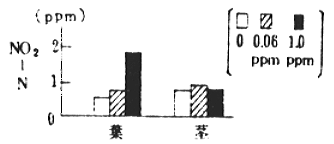 (7)亜硝酸はNO21.0ppm段階になると葉の増加量が著しく、茎での増加量は少なく、対照区に比べて茎葉間差が著しく大きかった。(図-3)したがって、茎葉の亜硝酸濃度を利用することによって、NO2被ばく判定の可能性がうかがわれた。(図-4)