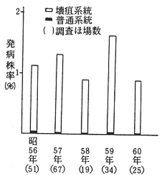 | 年次 | 症状 | 検定数 | エライザ検定 | 壊疽系統の 検出率(%) |